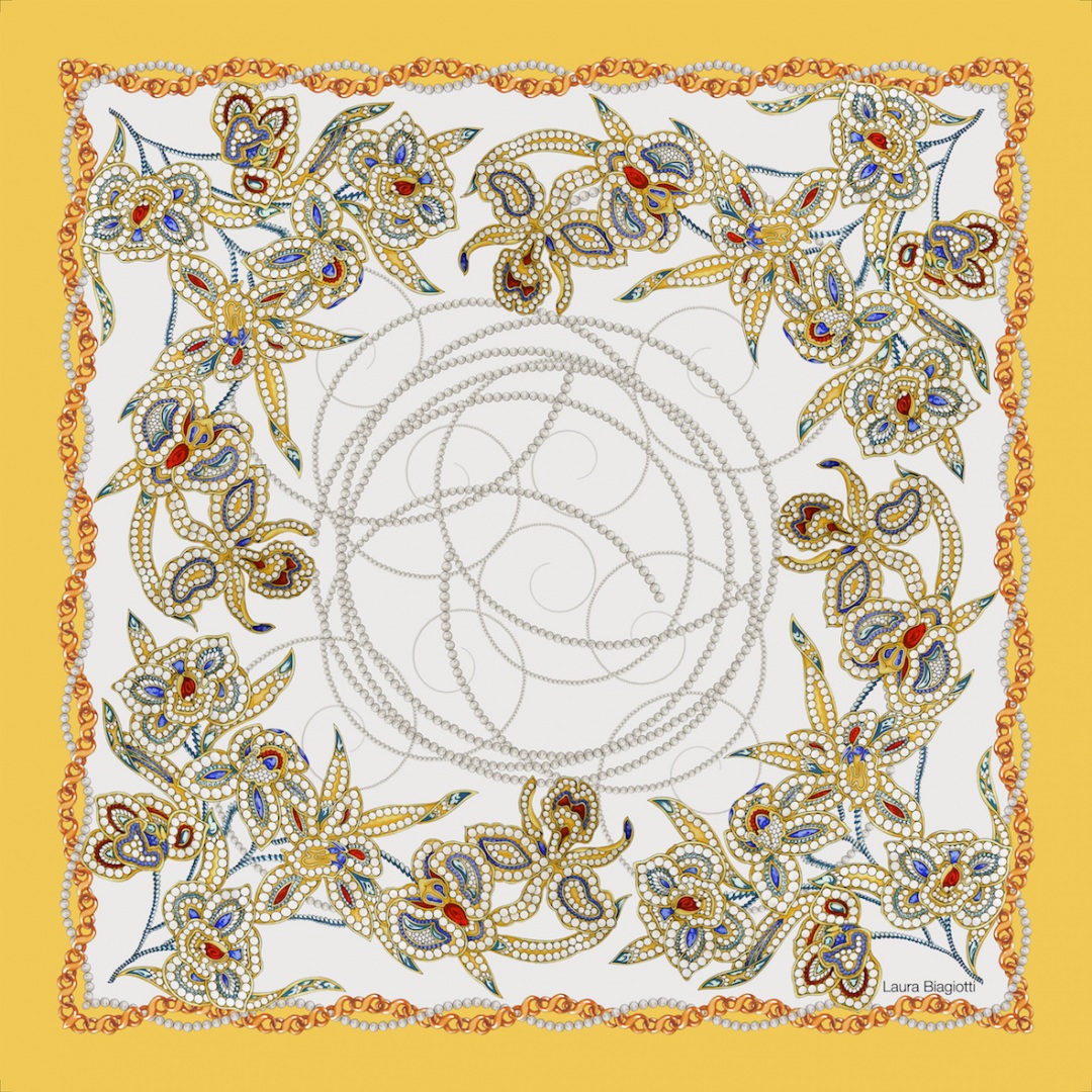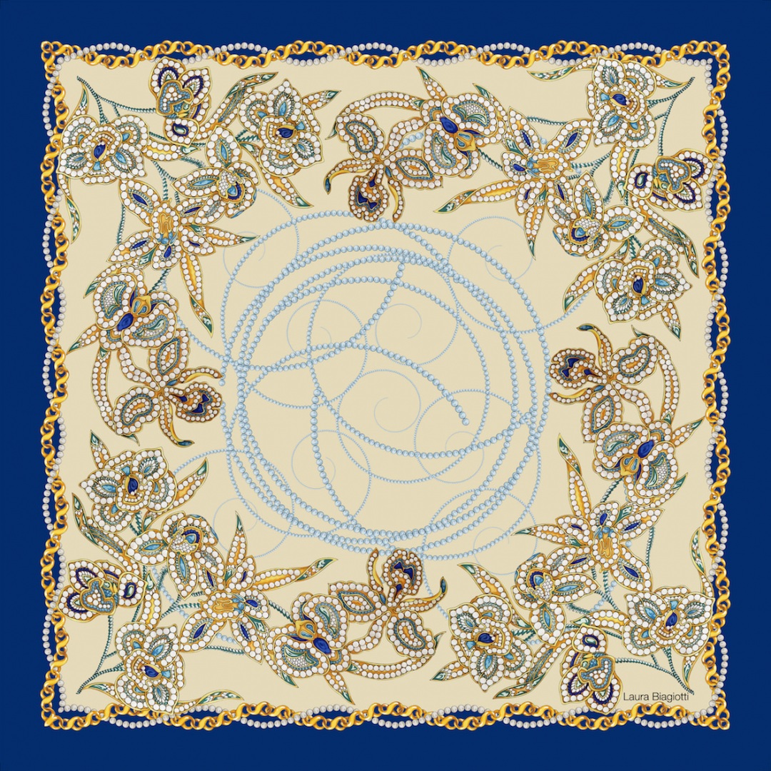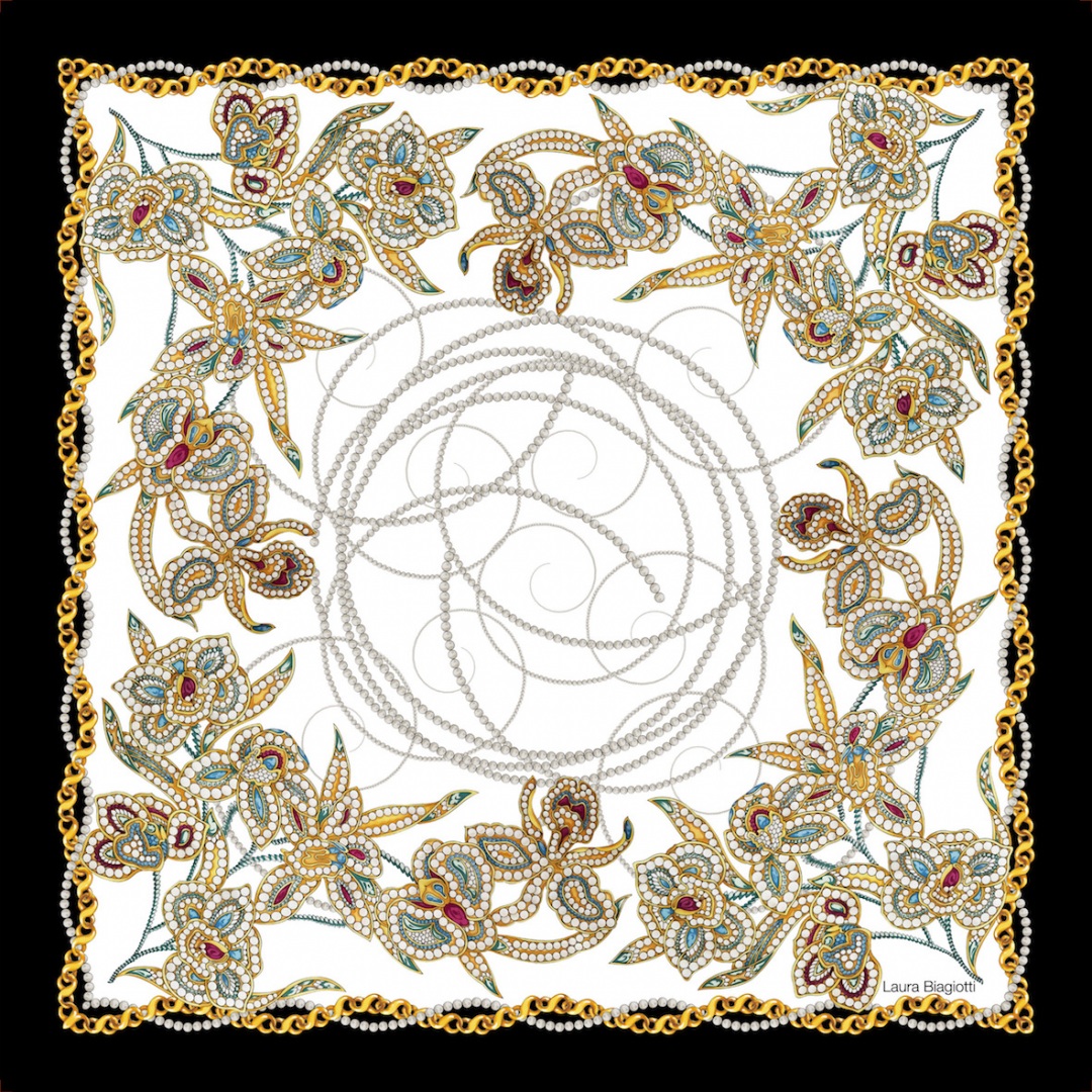 Una composizione floreale con gemme preziose e pregevoli catenelle che fanno da contorno.