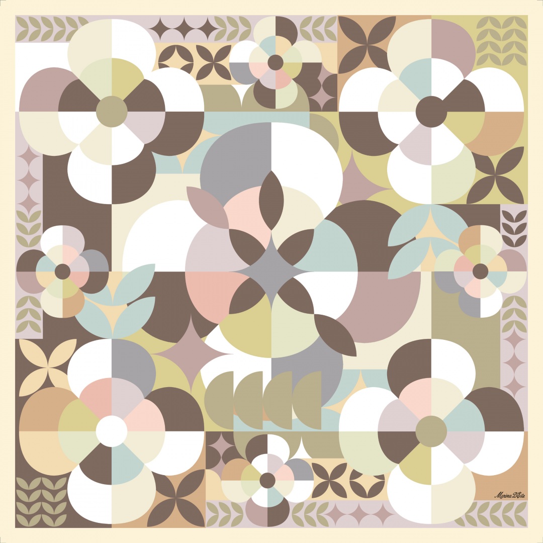 Il colore è padrone di una visione vivace e giovane. Fiori stilizzati si formano attraverso spicchi di colore in un insieme di effervescente bellezza