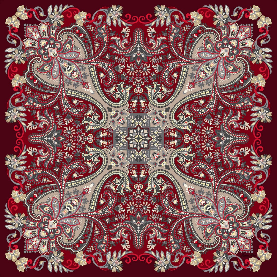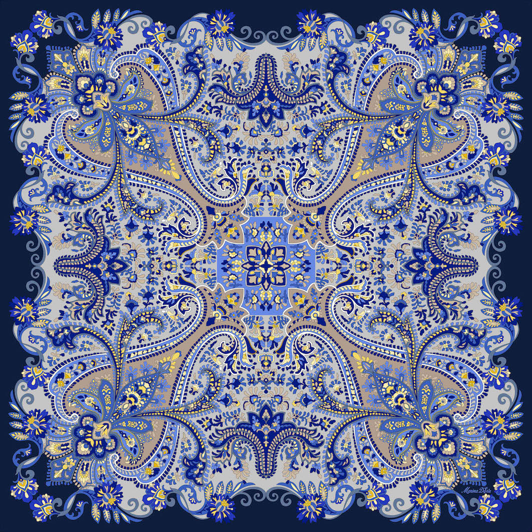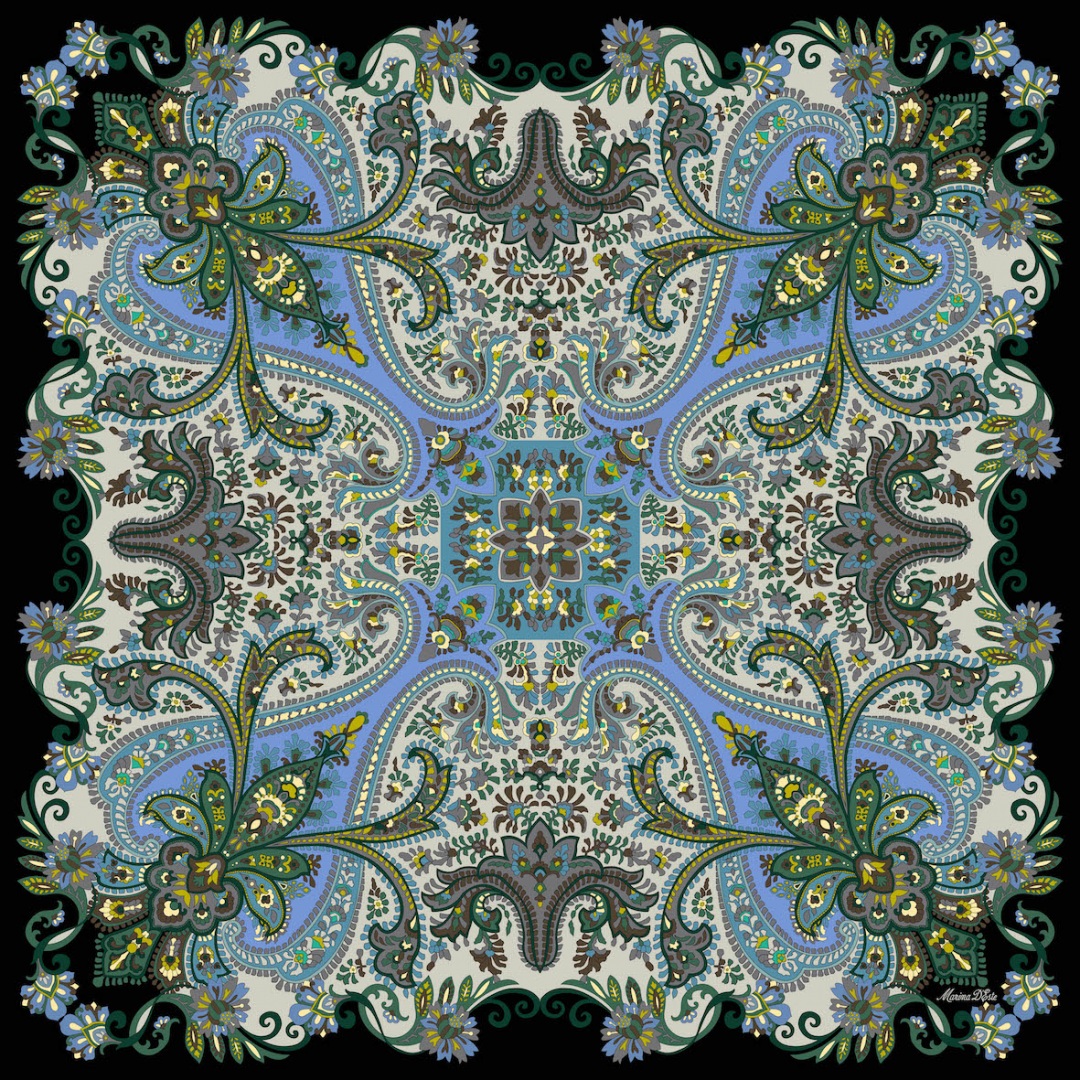 Detailed arabesque designs combine in a dancing effect of bright colors and intoxicating inserts. Contrasts, light, and symmetries in a striking silk scarf.