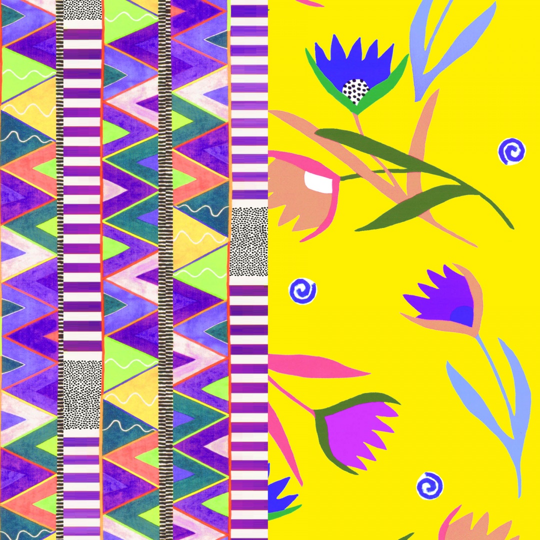 Colori accesi e un’aria gioiosa per per questi fiori allegri che dialogano con una greca multicolore. Reale, concreto e verace. Sincerità è bellezza.