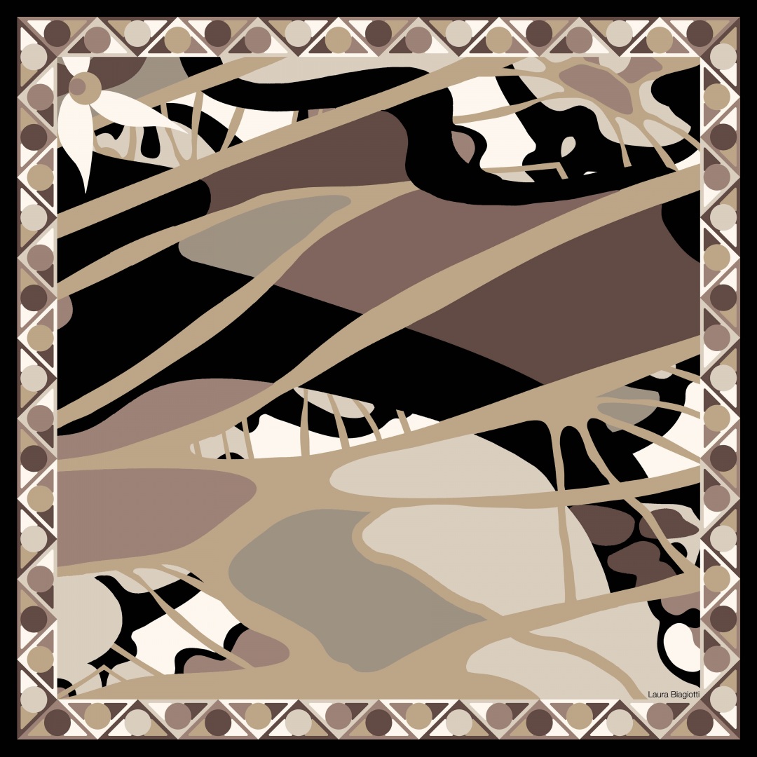Onde sinuose stabiliscono spazi di elegante colore, una greca racchiude questa bellezza vivace e geometrica.