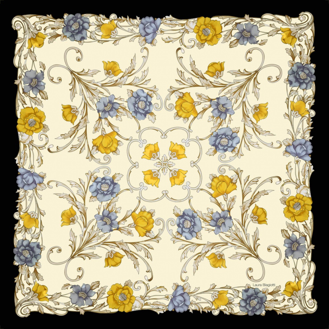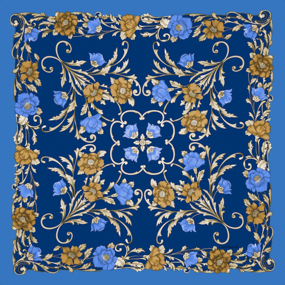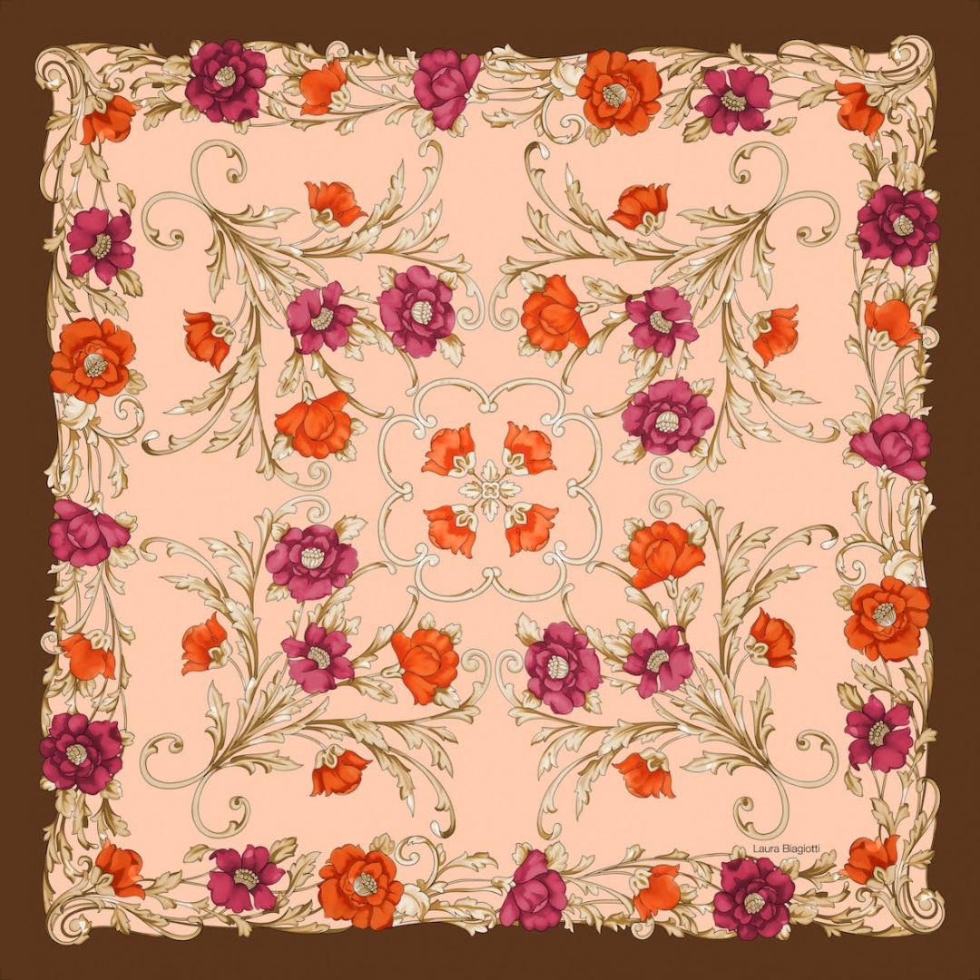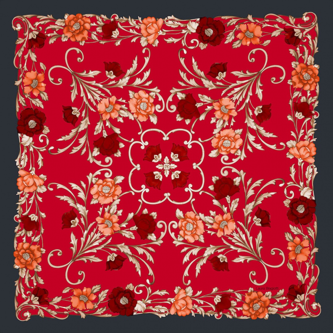 Dal centro all’esterno e dall’esterno al centro in un movimento di fiori e motivi lanceolati eleganti e suadenti.