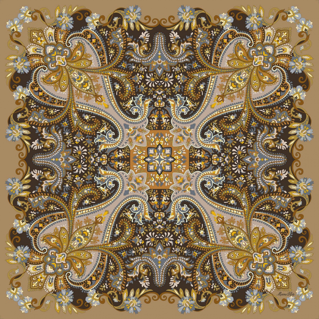 Minuziosi disegni arabeggianti si combinano in un effetto danzante tra colori luminosi e inserti inebrianti. Contrasti, luci e simmetrie in un foulard di seta di grande effetto.