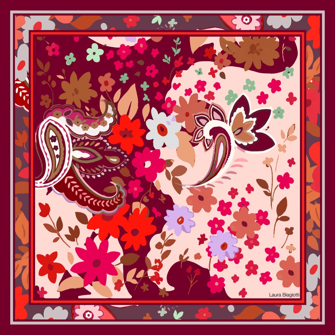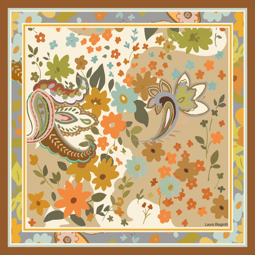 Due disegni cachemire danzano attorno a fiori stilizzati in cui curve, cornici e colori creando un effetto fantasmagorico. Brioso e giovane.