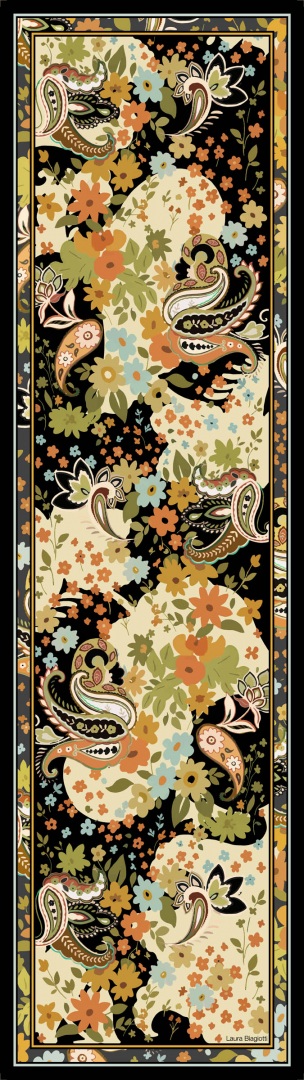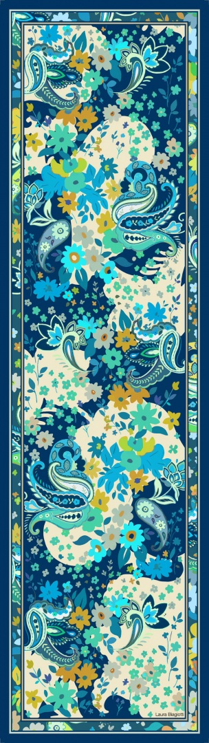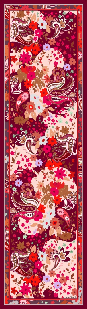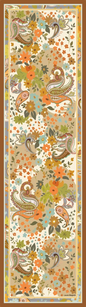 Disegni cachemire danzano attorno a fiori stilizzati in cui curve, cornici e colori creando un effetto fantasmagorico. Brioso e giovane.